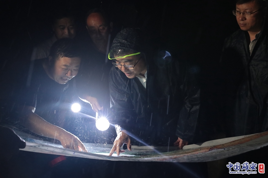 8月11日晚,河北省委常委、副省長,雄安新區黨工委書記、管委會主任陳剛冒雨深入白溝引河入淀口,調研檢查水情和防汛值守情況等防汛工作(2018年8月11日攝)。中國雄安官網記者劉東堯 攝