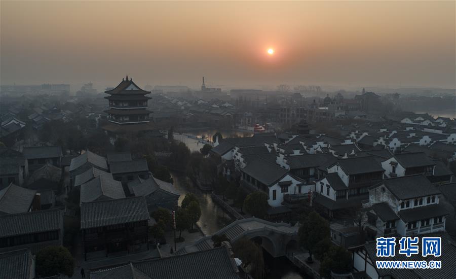 這是2019年1月1日在山東臺兒莊古城拍攝的日出。當日是新年第一天,朝陽升起,萬象更新。新華社發(高啟民 攝)