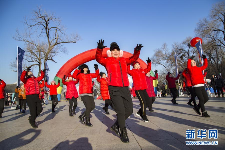2019年1月1日,在吉林省吉林市,人們在龍潭山公園舉行的新年登高健身大會上跳舞。