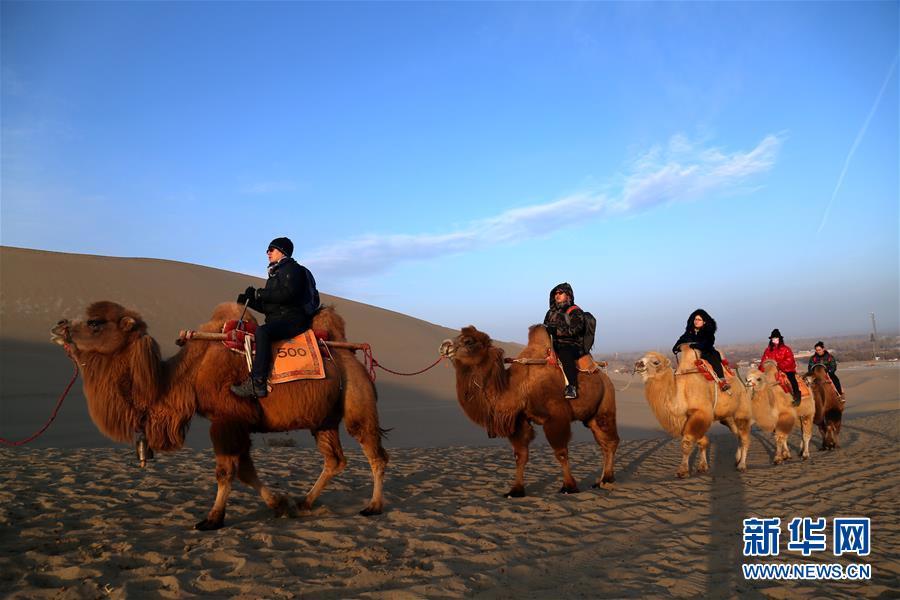 2019年1月1日,游客在甘肅省敦煌市鳴沙山月牙泉景區游覽。