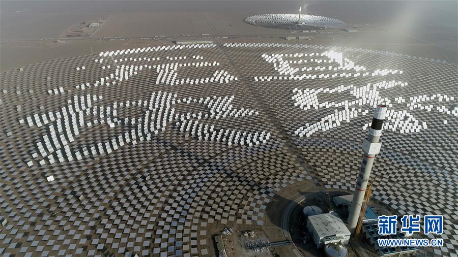 2019年1月1日,甘肅省敦煌市光電產(chǎn)業(yè)園區(qū)百兆瓦級(jí)熔鹽塔式光熱電站的定日鏡拼成巨型文字“元旦快樂”。