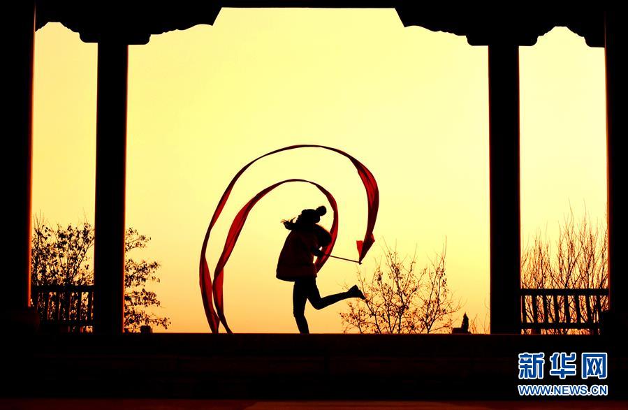 2019年1月1日,山東省淄博市沂源縣東里鎮的一名女孩在晨曦中起舞,迎接新年的到來。
