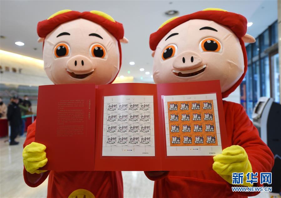 1月5日,在南京博物院《己亥年》郵品發售現場,裝扮成卡通豬形象的工作人員在展示《己亥年》特種郵票。新華社記者 孫參 攝