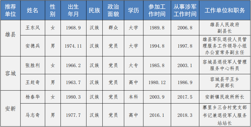 “河北雄安新區退役軍人管理服務工作先進個人”推薦人選基本情況匯總表
