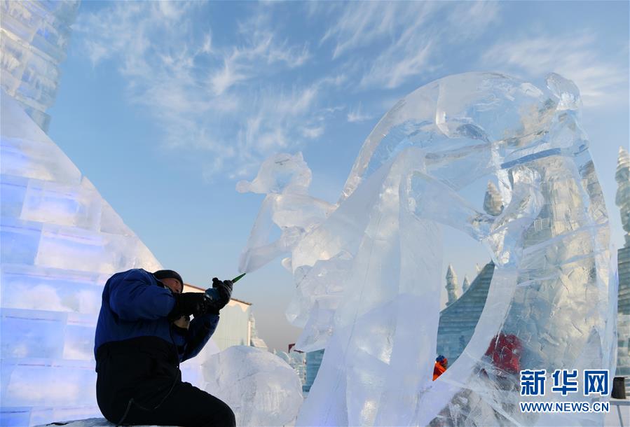 1月7日,參賽者在進行冰雕創(chuàng)作。 當日,在哈爾濱冰雪大世界園區(qū)進行的第三十三屆中國哈爾濱國際冰雕比賽進入第二天,參賽的冰雕作品已初露芳容。新華社記者 王建威 攝