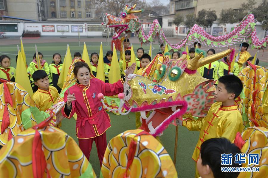 1月8日,河北省邢臺市東大街小學教師郭曉燕為學生講解舞龍知識。近年來,邢臺市東大街小學開展“傳承傳統文化 舞龍進校園”活動,把舞龍列入學校的傳統文化課程,學生們在老師的指導下學習舞龍的扭、揮、跳、搖等技法,讓孩子們體驗舞龍的魅力,促進傳統文化的保護和傳承。新華社發(陳雷 攝)