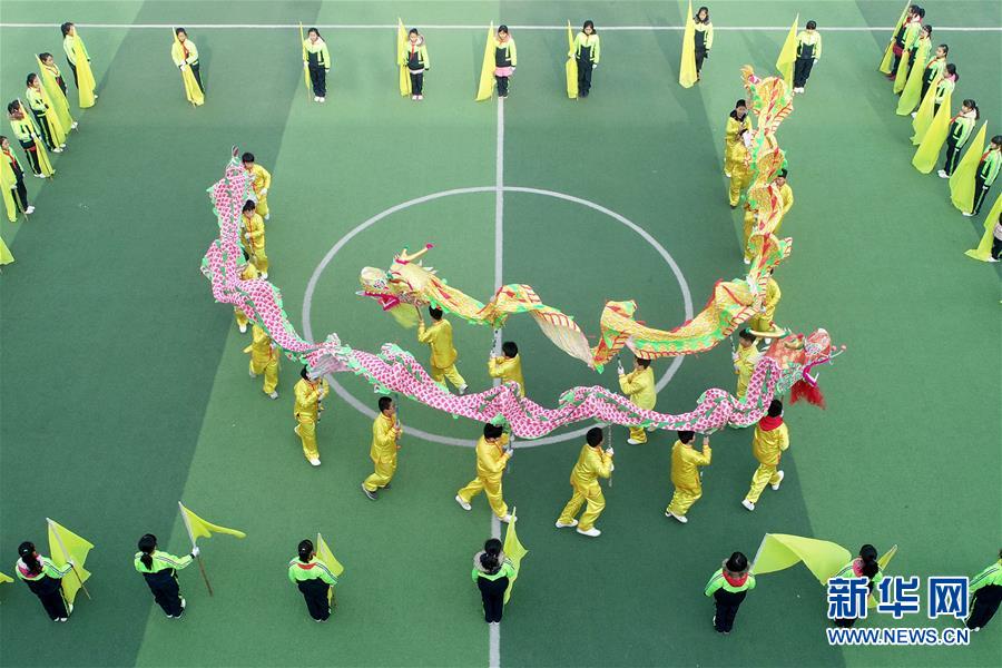 1月8日,河北省邢臺(tái)市東大街小學(xué)學(xué)生在演練舞龍(無(wú)人機(jī)拍攝)。近年來(lái),邢臺(tái)市東大街小學(xué)開(kāi)展“傳承傳統(tǒng)文化 舞龍進(jìn)校園”活動(dòng),把舞龍列入學(xué)校的傳統(tǒng)文化課程,學(xué)生們?cè)诶蠋煹闹笇?dǎo)下學(xué)習(xí)舞龍的扭、揮、跳、搖等技法,讓孩子們體驗(yàn)舞龍的魅力,促進(jìn)傳統(tǒng)文化的保護(hù)和傳承。新華社發(fā)(陳雷 攝)