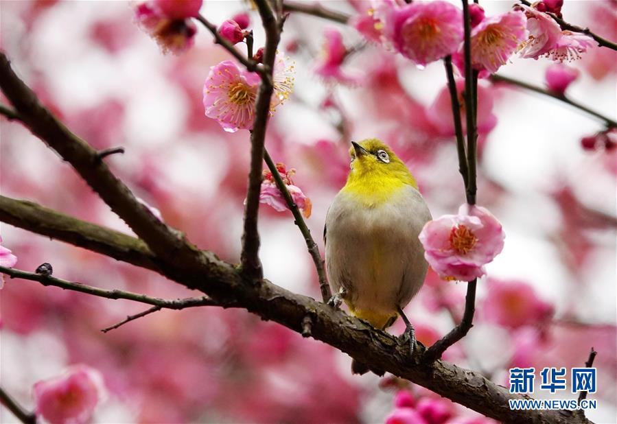 1月9日,在貴陽市南明河畔,一只小鳥被盛開的梅花吸引。新華社發(秦剛 攝)