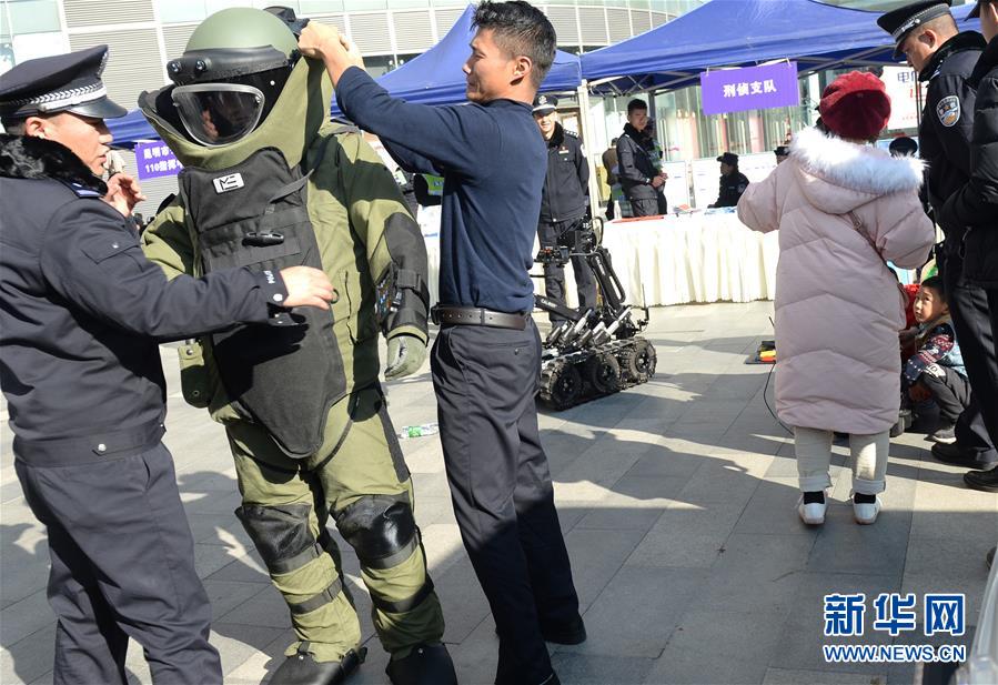 1月10日,昆明市民試穿防爆服。當日是全國第33個110宣傳日,多地警方舉辦宣傳活動。新華社記者 秦晴 攝