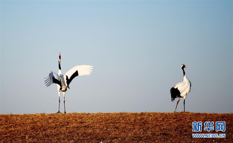 在黑龍江扎龍國家級自然保護區,兩只人工繁育的丹頂鶴在“散步”、“起舞”(1月10日攝)。