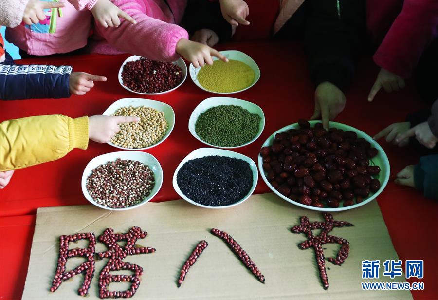 1月11日,山東省臨沂市郯城縣郯城街道官塘幼兒園的小朋友在辨認(rèn)制作臘八粥的食材。臘八節(jié)將至,各地學(xué)校、幼兒園開(kāi)展“迎臘八”主題活動(dòng),小朋友們?cè)诶蠋煹闹笇?dǎo)下了解臘八習(xí)俗,感受傳統(tǒng)文化魅力。新華社發(fā)(張春雷 攝)