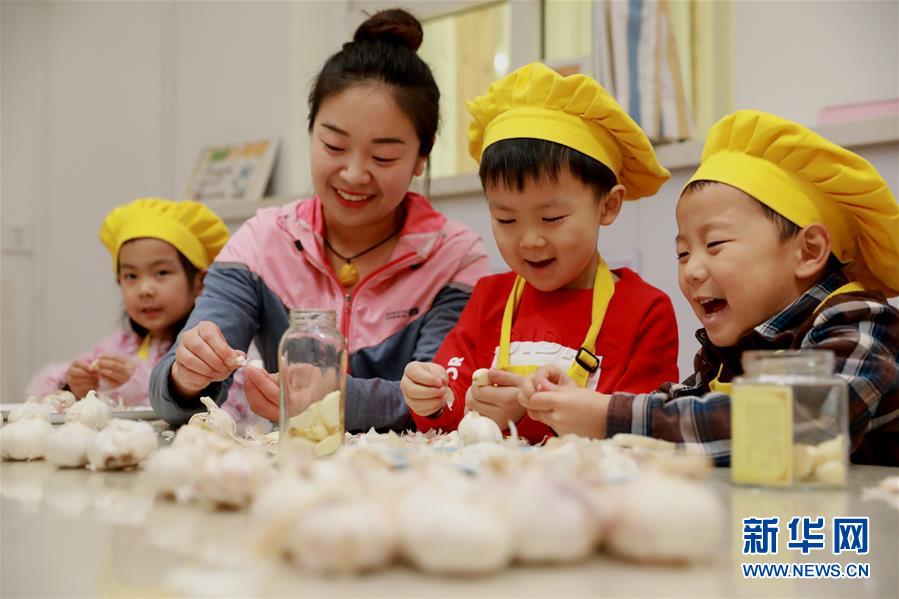1月11日,在河北石家莊市第一幼兒園,老師和孩子們在剝蒜準備腌制臘八蒜。臘八節將至,各地學校、幼兒園開展“迎臘八”主題活動,小朋友們在老師的指導下了解臘八習俗,感受傳統文化魅力。新華社發(梁子棟 攝)