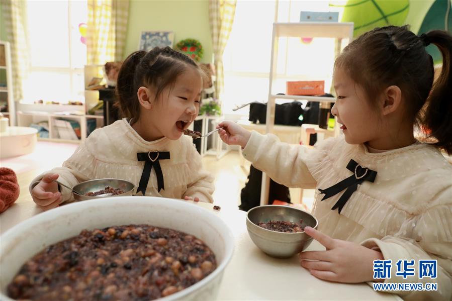 1月11日,在河北石家莊市第一幼兒園,一對雙胞胎姐妹在喝臘八粥。臘八節(jié)將至,各地學(xué)校、幼兒園開展“迎臘八”主題活動,小朋友們在老師的指導(dǎo)下了解臘八習(xí)俗,感受傳統(tǒng)文化魅力。新華社發(fā)(梁子棟 攝)