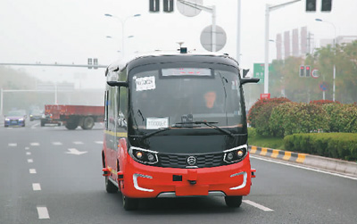 去年,全國首張智能網(wǎng)聯(lián)商用汽車開放道路測試牌照頒發(fā)。圖為全國首輛自動駕駛電動巴士在開放道路進(jìn)行載人測試。
