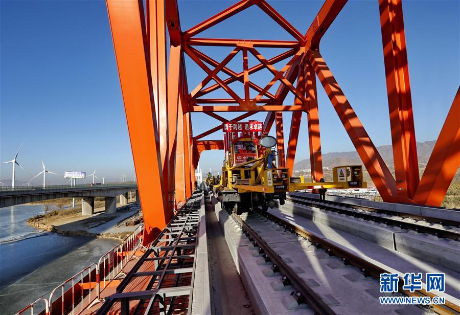 1月13日,中鐵三局的工人在京張高鐵官廳水庫特大橋進行鋪軌作業(yè)。新華社記者 楊世堯 攝