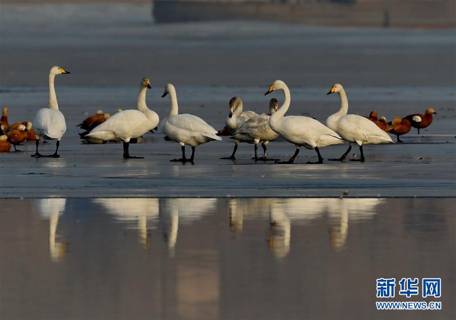 1月13日,天鵝等水鳥在張家口市宣化區洋河水庫休憩。近年來,河北省張家口市宣化區立足京津冀生態涵養區的功能定位,不斷加大環境治理和生態功能修復力度,使洋河水庫及周邊濕地成為天鵝、大雁、野鴨、灰鶴等多種鳥類南北遷徙中的棲息地。新華社記者楊世堯攝