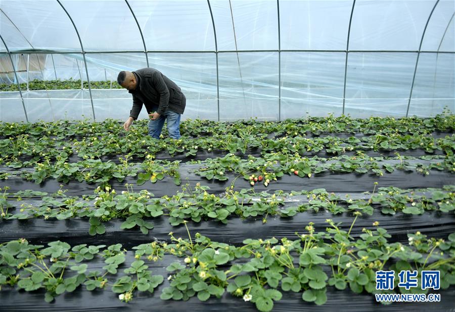 1月14日,宣恩縣珠山鎮(zhèn)甘溪村農(nóng)民在草莓大棚內(nèi)忙碌。新華社發(fā)(宋文 攝)