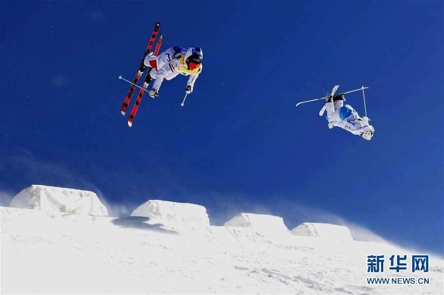 這是運動員在張家口市崇禮區太舞滑雪場參加自由式滑雪雪上技巧世界杯比賽(2018年12月16日攝)。