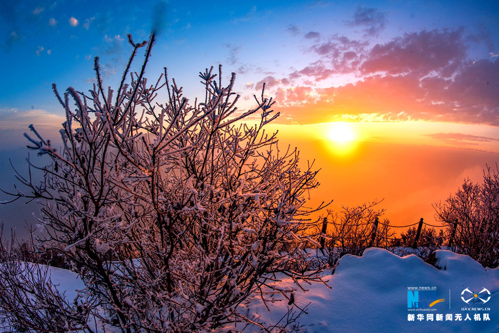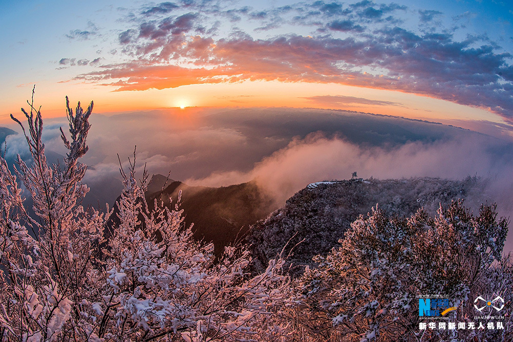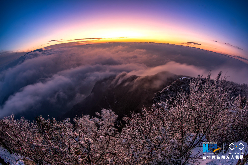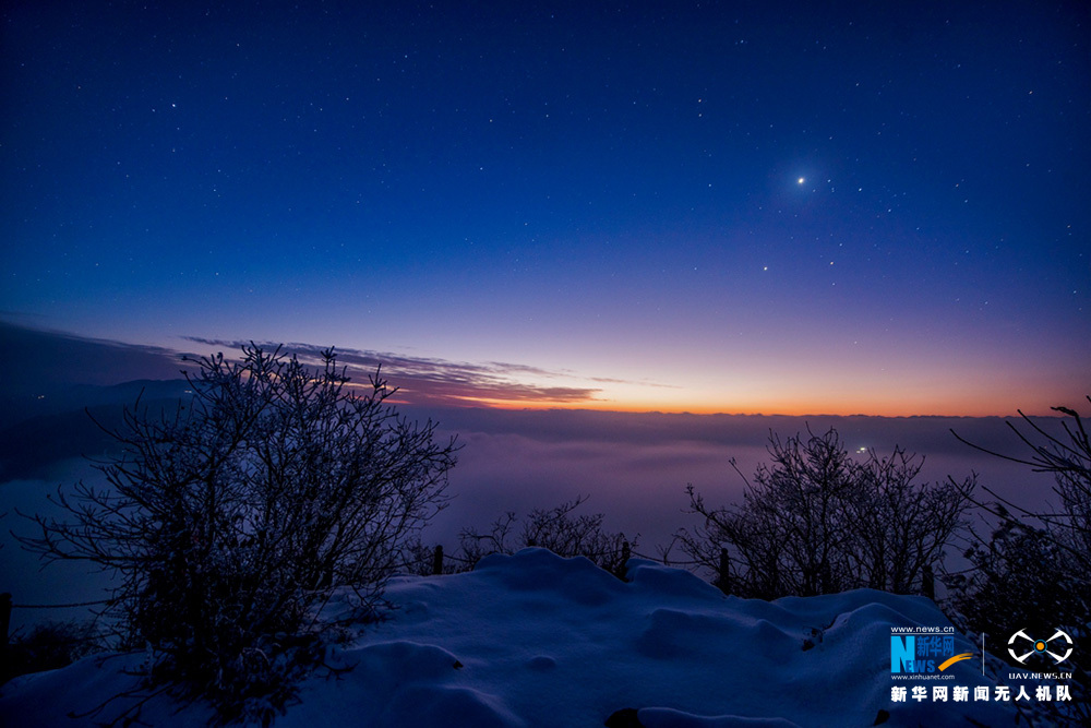 臘月時節,瞿塘峽北岸的赤甲山頂,被皚皚白雪覆蓋,隨著光線的變化,呈現出別樣的美景。圖為赤甲山頂黎明時分。新華網發(何川 攝)