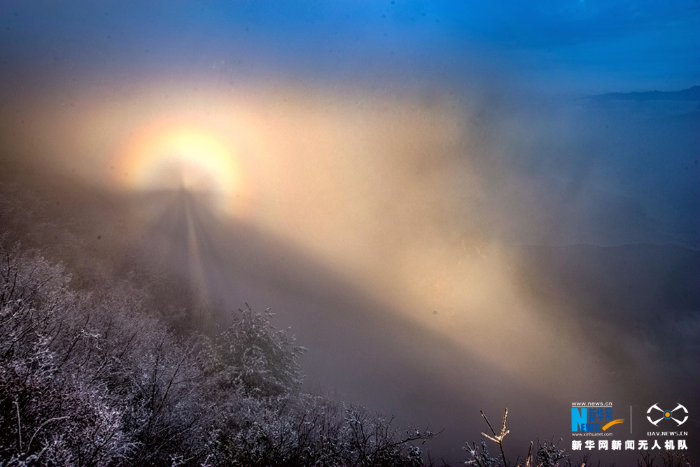 臘月時節,瞿塘峽北岸的赤甲山頂,被皚皚白雪覆蓋,隨著光線的變化,呈現出別樣的美景。山頂被積雪覆蓋,江面則被濃霧籠罩。新華網發(何川 攝)