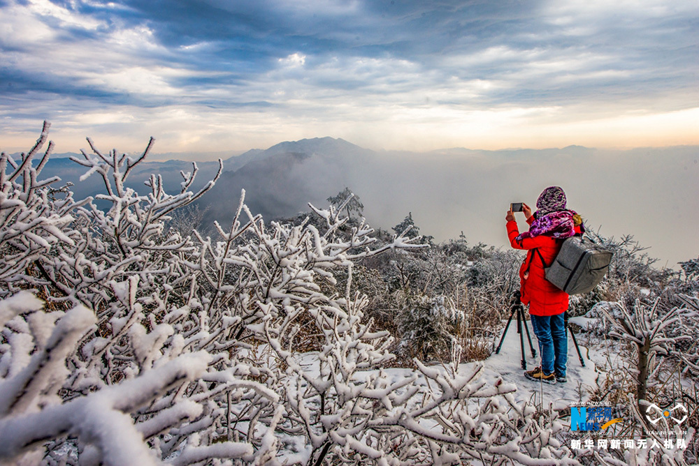 臘月時節,瞿塘峽北岸的赤甲山頂,被皚皚白雪覆蓋,隨著光線的變化,呈現出別樣的美景。圖為攝影愛好者在赤甲山頂拍照。新華網發(何川 攝)