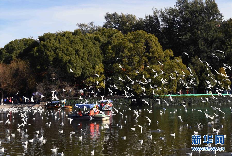游人在昆明翠湖公園觀賞紅嘴鷗(1月13日攝)。入冬以來,數萬只紅嘴鷗飛臨云南昆明翠湖公園、滇池海埂大壩等地,成為城市一道亮麗的風景。新華社記者楊宗友攝