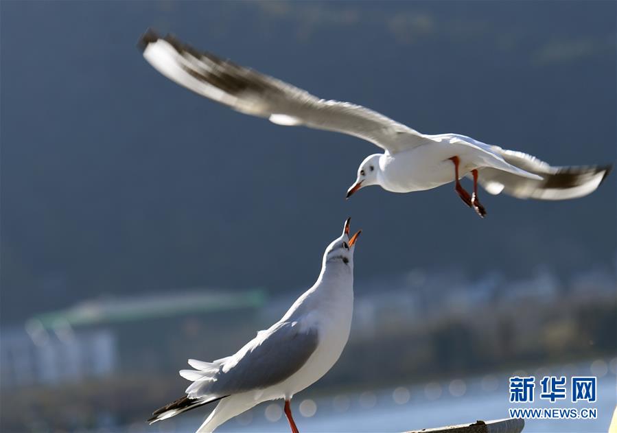 兩只紅嘴鷗在昆明滇池海埂大壩嬉戲(1月11日攝)。入冬以來,數萬只紅嘴鷗飛臨云南昆明翠湖公園、滇池海埂大壩等地,成為城市一道亮麗的風景。新華社記者楊宗友攝