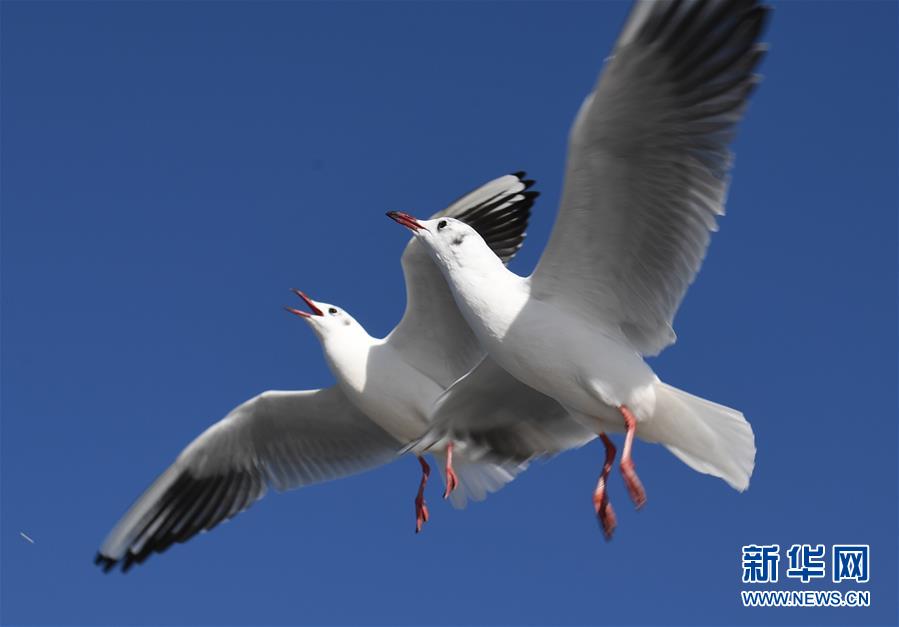 兩只紅嘴鷗在昆明滇池海埂大壩上空飛舞(1月11日攝)。入冬以來,數萬只紅嘴鷗飛臨云南昆明翠湖公園、滇池海埂大壩等地,成為城市一道亮麗的風景。新華社記者楊宗友攝