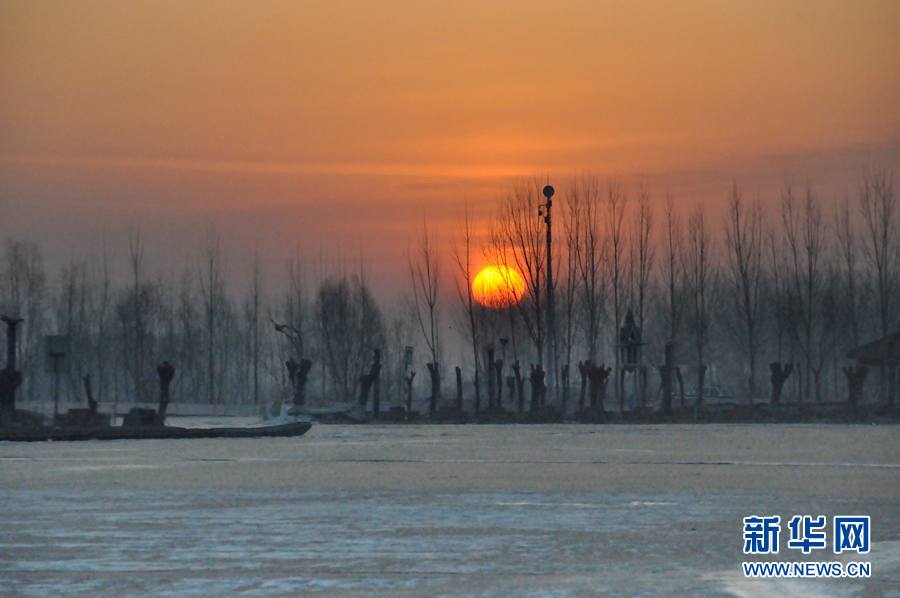 1月16日,白洋淀上朝陽冉冉升起。新華網發(馬曉 攝)