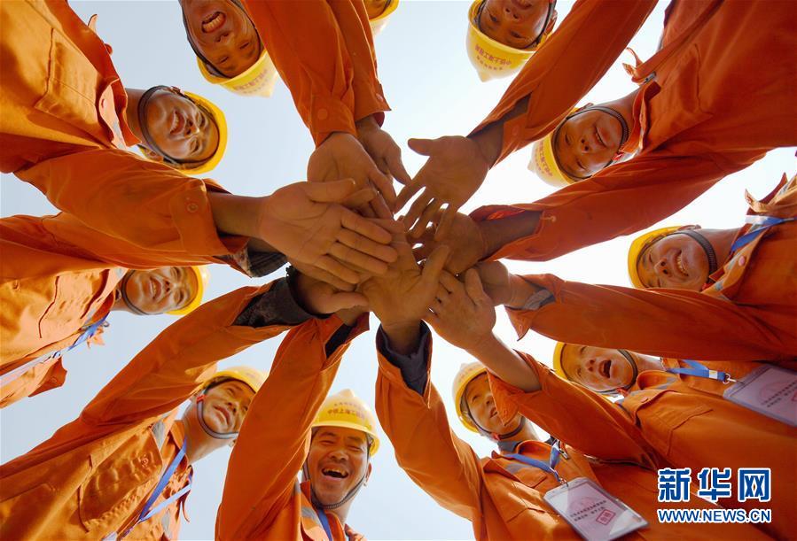 京雄城際鐵路工程五標段小型構件預制廠場地建設現場,工人們用擊掌的方式相互鼓勁(2018年4月28日攝)。 新華社記者 王曉 攝