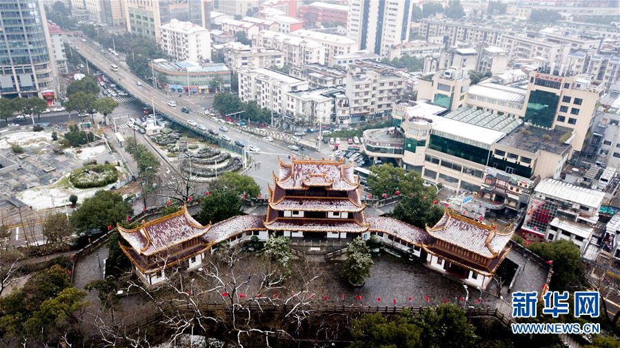 當日,湖南長沙市迎來一場降雪,古城樓天心閣在白雪的覆蓋下顯得靜謐雅致。