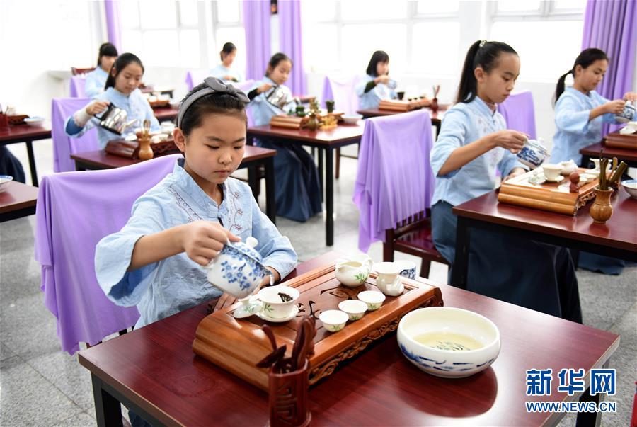 1月22日,南和縣新區(qū)小學(xué)學(xué)生在參加茶藝特色班。
