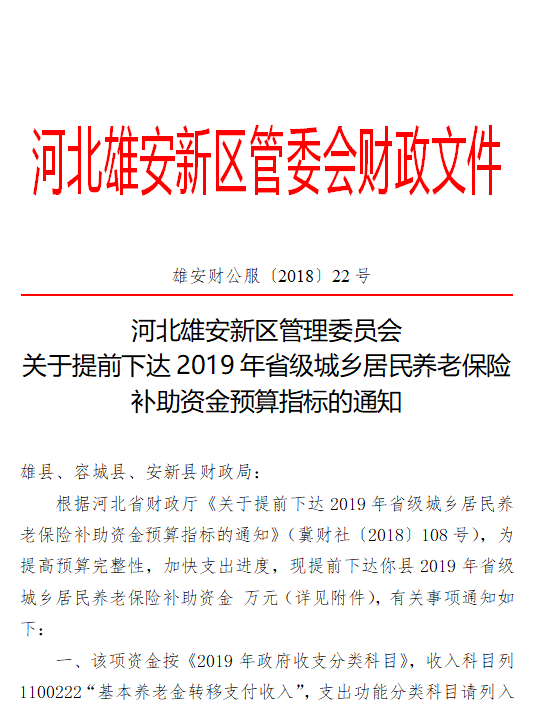 現將雄安新區提前下達2019年省級城鄉居民養老保險補助資金預算指標資金分配結果予以公告,如有異議,請向以下部門提出意見。