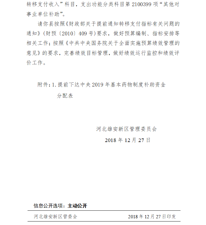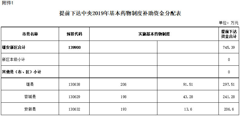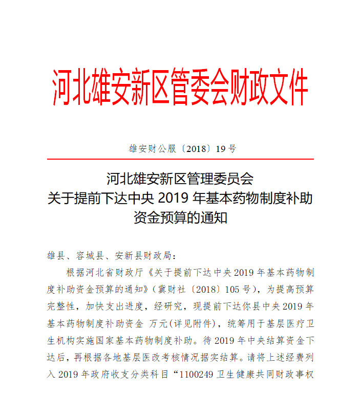 現將雄安新區提前下達中央2019年基本藥物制度補助資金預算資金分配結果予以公告,如有異議,請向以下部門提出意見。