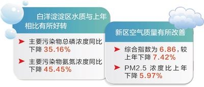 2018年,雄安新區生態環境局精準把握“雄安質量”生態環境內涵,將生態環境視為新區發展生命線,強化標本兼治,推進綜合治理,交出了一份令人滿意的成績單。白洋淀淀區水質與上年相比有所好轉,主要污染物總磷、氨氮濃度同比分別下降35.16%、45.45%,改善效果明顯。新區空氣質量有所改善,綜合指數為6.86,較上年下降7.42%,PM2.5濃度比上年下降5.97%。