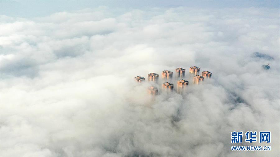 當(dāng)日,銅仁市萬(wàn)山區(qū)上空出現(xiàn)平流霧景觀,建筑物、山巒在霧氣中若隱若現(xiàn)。新華社發(fā)(伍衛(wèi)東 攝)