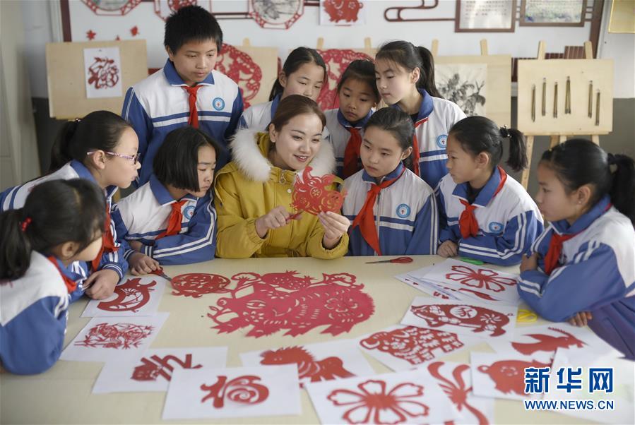 1月24日,邢臺市西北留小學老師在指導學生剪紙。