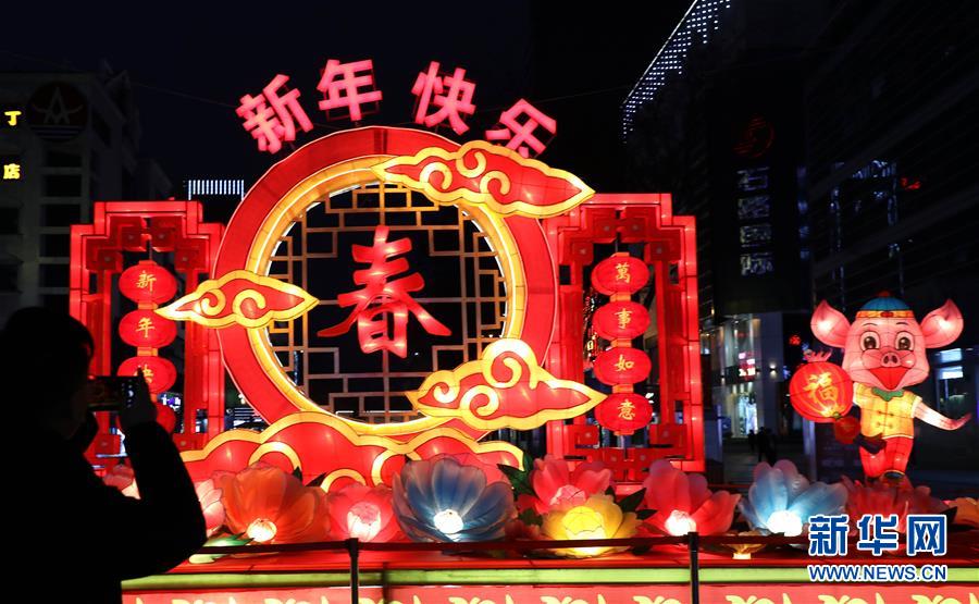 1月25日,市民在江蘇蘇州石路步行街上的“福豬迎春”彩燈前拍照。隨著春節臨近,春聯、福字和紅燈籠扮靚了大街小巷。新華社發(杭興微 攝)
