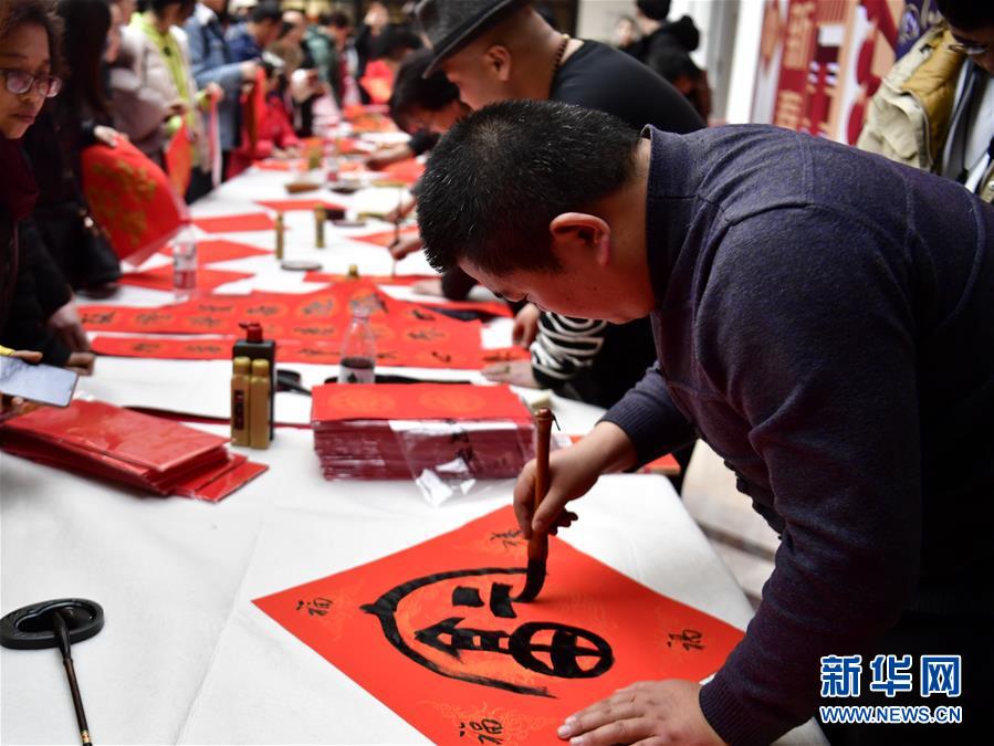 當日,青海西寧海湖路社區舉行迎新春送春聯進社區活動,青海省書法家協會的近20位書法家為市民書寫春聯,迎接即將到來的春節。新華社發(張龍 攝)