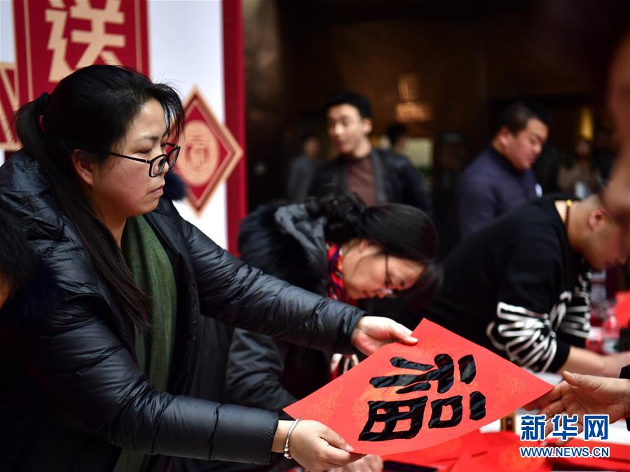 1月26日,一名書法家在活動現場為市民送“福”字。新華社發(張龍 攝)