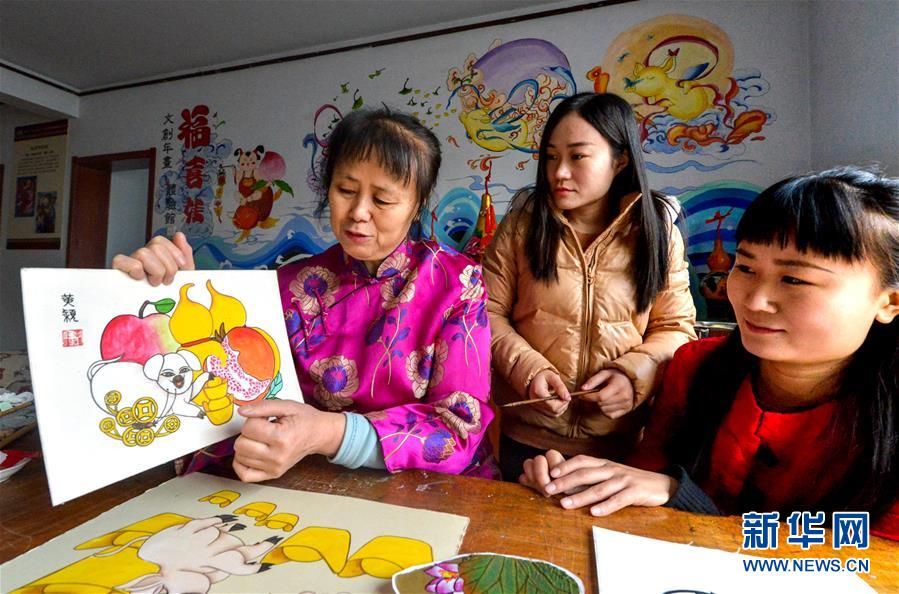 2月2日,黃穎(左)在她的工作室指導學生手繪年畫的繪畫技法。