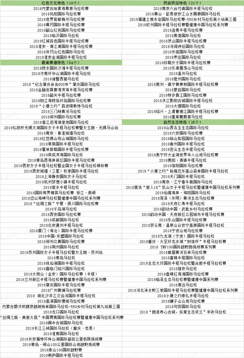同時,中國田徑協會還評選出了包括紅色文化特色、民族民俗特色、自然生態特色、最美賽道特色在內的120個特色賽事,其中2018河間詩經國際馬拉松大賽被評為民族民俗特色賽事,2018雄安馬拉松、2018河北淶水野三坡國際半程馬拉松賽暨健康中國馬拉松系列賽、2018小康之約崇禮半程馬拉松被評為自然生態特色賽事。(見習記者劉洋)