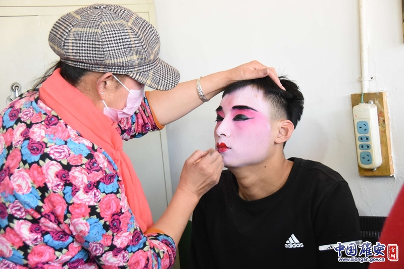 清早,梁神堂村委會內,熱心村民為一名高蹺表演者上妝。參與“登云圣會”的表演者均為男性,其中不乏年輕面孔。中國雄安官網記者朱偉琳 攝