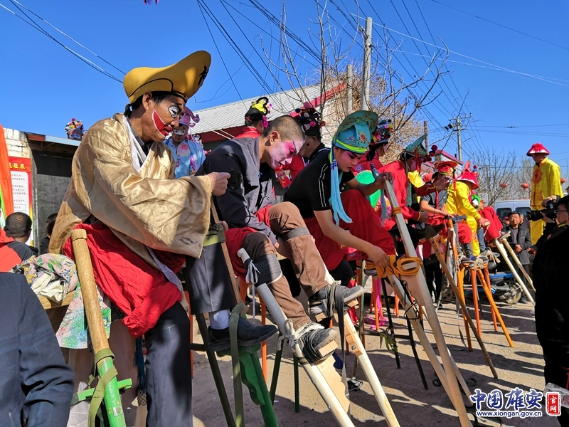 一排群眾演員在綁高蹺,他們主要是梁神堂村的村民,此外還有宮崗村、程崗村等村的高蹺愛好者前來助興。中國雄安官網記者朱偉琳 攝