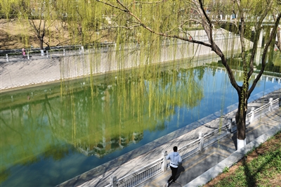 3月16日,北京,南護(hù)城河岸邊的垂柳抽出嫩綠的枝葉,一名男子正跑步經(jīng)過(guò)。圖/視覺(jué)中國(guó)