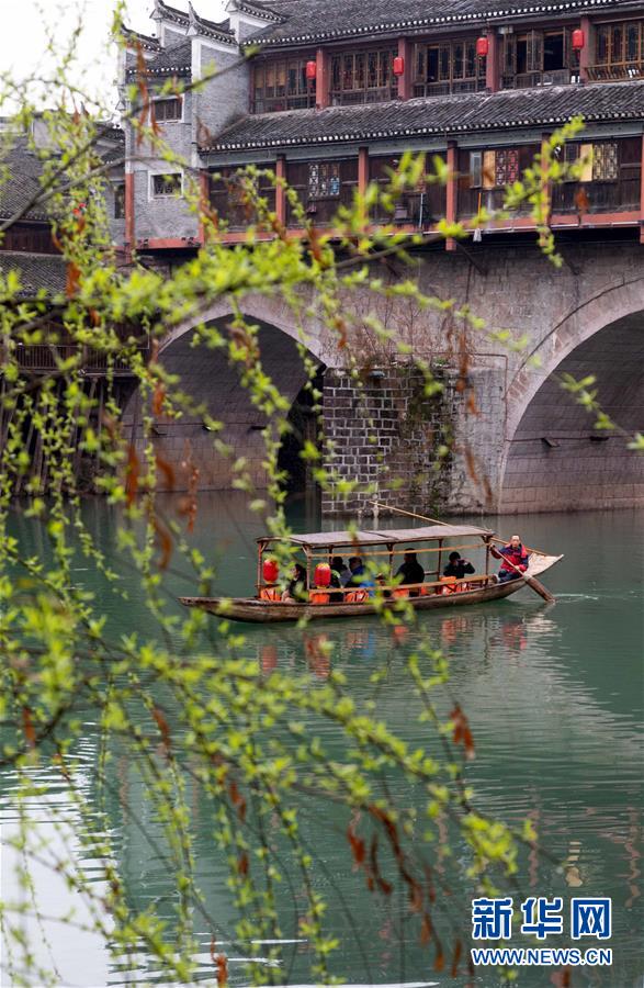 3月16日,游客在湖南省湘西土家族苗族自治州鳳凰古城沱江河上泛舟游覽。隨著氣溫上升,萬物復(fù)蘇,柳枝吐出新芽,透出春天的氣息。新華社發(fā)(劉振軍 攝)