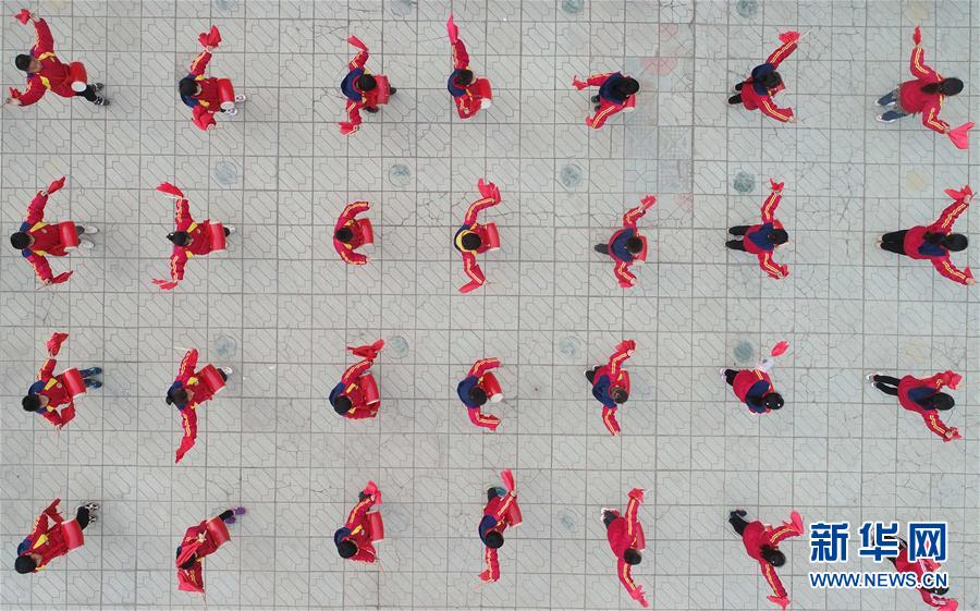 3月20日,百泉小學學生在練習打腰鼓(無人機拍攝)。近年來,河北邢臺經濟開發區百泉小學積極開展“陽光大課間”系列活動,將傳統腰鼓引入校園,開設校本課程,豐富校園文化生活。新華社記者 朱旭東 攝