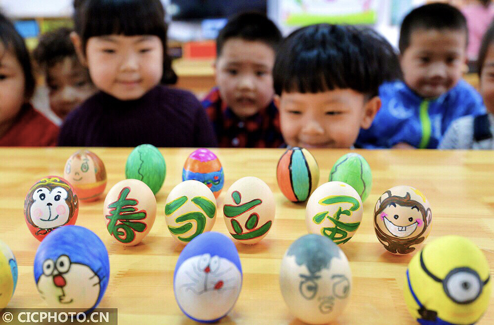 2016年3月20日,河北省邯鄲市峰峰礦區區直機關幼兒園的小朋友們在玩“立蛋”游戲。CICPHOTO/郝群英 攝