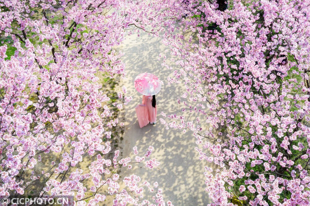 2019年3月14日,游客在江蘇南京中山植物園觀賞櫻花。CICPHOTO/蘇陽 攝