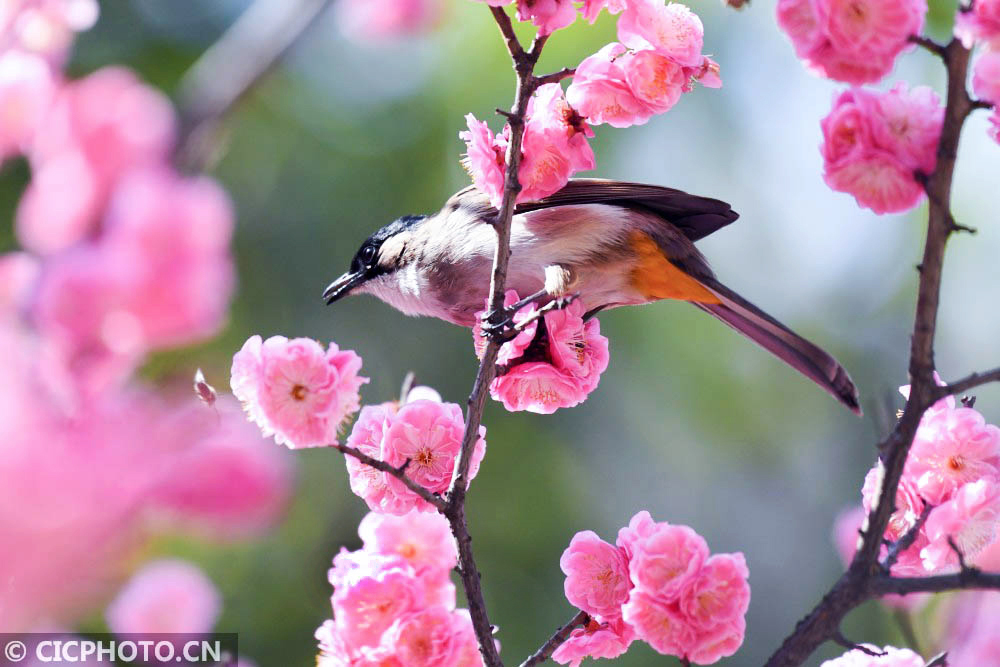 2019年3月3日,貴州省仁懷市街頭,一只小鳥在花枝上小憩。CICPHOTO/陳勇 攝